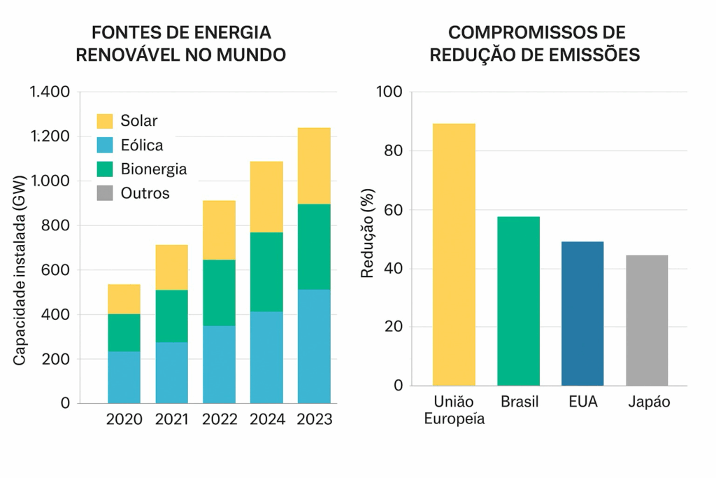 A transição energética é um dos temas centrais da COP30. Dados recentes mostram que, em 2024, o mundo registrou um recorde de 582 gigawatts em novas fontes renováveis. Enquanto economias desenvolvidas ampliam investimentos em energia solar, eólica e hidrogênio verde, países em desenvolvimento buscam reduzir a dependência de combustíveis fósseis e melhorar a eficiência energética, com apoio de fundos multilaterais.